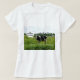 Schwarz-Weiß-Kuh stehend auf der Weide, mit einem kleinen humorvollen Sprichwort: "Ich bin hervorragend in meinem Feld!"