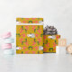 Eine Rolle Packpapier für Weihnachten, mit einem Muster von Santas, Holly und Ho, Ho, Ho, Ho auf einem goldfarbenen Hintergrund, den Sie leicht ändern können, mit der Schaltfläche Bearbeiten. Das Design stammt aus einer handbemalten PapierCollage von Judy Adamson.