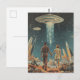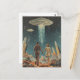 Diese Retro-inspirierte Postkarte zeigt ein Paar, das Händchen hält, während es auf einem Planeten der Alien in Richtung eines UFO spaziert und dabei einen weißen kristallinen Strahl abschießt.