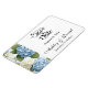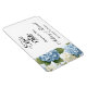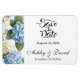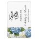 Save the Date Magnet wird in einem klassischen formalen Layout in der Farbe weiß angezeigt, mit schwarzem Text und Skripttext, der die Namen von Bride und Groom hervorhebt und mit einem hydrangea-Blume-Druck versehen ist. Klicken Sie auf die Schaltfläche Anpassen, gehen Sie rechts zu den Textfeldern und ändern Sie den entsprechenden Text in Ihren Text. Stock Image freepik.com all-free-download.com