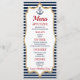 Das ist eine Geburtstagsfeier-Menü. b-Tag Junge Frau Essen Menü Eintritt Getränke Vorspeise Dessert Tischmenü nautische Marine blauen Anker Boot Ozean Red Gold Glitzer Brunch ahoy