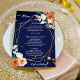 Orangefarbene und weiße Rosen Salbei eucalyptus grün marineblaue goldfarbene Rahmen Rahmen Blumenmenü-Vorlage mit Getränkeliste an der Rückseite, wenn Sie nicht trinken, können verwenden, um Programm zu schreiben, oder etwas Anderes, oder verlass es leer.