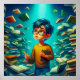 Eine Bookish Odyssey eines Jungen verloren im Meer des Wissens, Surfen Sie die Wellen der Weisheit! In einem Meer von Büchern verloren, steht ein Junge mit Brille hoch und umschließt die Wunder des Wissens und des Lernens.