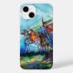 Mittelalterliche Ritter mit Pferden, farbenprächtige und ausdrucksvolle zeitgenössische figurative Malerei in lebhaften blauen, roten, grünen, braunen Farben, Aquarell von Alessandro Lumini 1989 Inspiriert aus der Legende von König Artus und den Rittern des Runden Tisches. Dieses coole und künstlerische Design ist auch ein wunderbares Geschenk für Weihnachten und besondere Anlass.