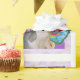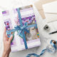 Sphynx Katze Ninja mit feenhaften Flügeln auf lila Blumenverpackungspapier.