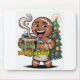 A joyful, cartoon-style Gingerbread Man, depicted with a wide, enthusiastic smile and rosy cheeks. He's wearing a simple white apron and heartily holding up a clear mug filled with dark, steaming coffee, with a prominent plume of steam curling upwards. The text "Spicy and Caffeinated" is creatively integrated onto the coffee mug in a bold, vibrant, multi-colored font, featuring subtle star and flake embellishments. In the background, a minimalist yet festive green Christmas tree is adorned with red and gold baubles, topped with a star, and radiating faint yellow light rays. The overall style is clean, cheerful, and graphically strong, with clear outlines.