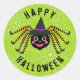 Dieser Aufkleber enthält eine niedliche Spinne, die in ihrem Hexenkostüm auf ihrem Netz sitzt und mit gestreiften Strümpfen, Hexenschuhen und Hut versehen ist. Der Aufklebertext heißt "Happy Halloween!" Kunst von Anne Coffey.