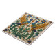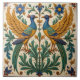Zwei Pfauen, die sich gegenüberstehen, mit blauen Köpfen, gelben Flügeln und grünen Schwänzen, umgeben von Blumenschmuck auf einer quadratischen Kachel.