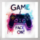 Spiel auf! Controller Art - Ein schwarzer Gaming-Controller mit leuchtenden neonrosa und blauen Akzenten wird vor einem weißen Hintergrund dargestellt. Der Controller befindet sich in der Bildmitte, mit den Wörtern "GAME" und "FACE ON!" in einem fett, schwarz geschriebenen Schriftart mit Pinselstrich darüber und darunter. Der Hintergrund ist mit abstrakten Aquarellsteinen in Rosa, Blau und Rot gestaltet, die eine kraftvolle und dynamische Atmosphäre schaffen.