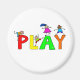 Niedliche Cartoon-Abbildung von kleinen Jungen und Mädchen, die über gigantische Buchstaben des Alphabets klettern, die das Wort PLAY ausdrücken. Bilder auf verschiedenen Geschenken und Produkten erhältlich. Magnete.