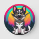 Illustration eines fröhlichen Cartoon-Hundes, der vor einem farbenprächtigen Regenbogen-Hintergrund sitzt und ein spielerisches Ambiente bietet, umgeben von einer ruhigen Waldlandschaft, die Freude und lebendige Kunst betont.