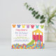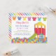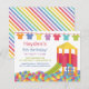 Eine bunte Einladung mit einer Regenbogenfarbpalette, die eine Spielplatzhausausrüstung mit einem Dia und einer Leiter, die, kennzeichnet innerhalb einer Ballgrube entsprochen wird. An der Spitze sind Kind, das T-Shirts in einer Zusammenstellung von Farben an eine Wäscheleine hängen. Groß für ein themed Kindergeburtstag-Party des Spielplatzes. Personifizieren Sie leicht mit Ihren Partysonderkommandos im bereitgestellten Raum.