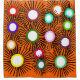 Dieser Duschvorhang ist mit weißen Kreisen mit verschiedenen farbigen Konturen und schwarzen Linien bedeckt, die dann auf einem orangefarbenen Feld entstehen.