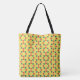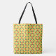 Ladys große Schultertasche in einem Muster von Kreisen, jeder Kreis besteht aus abwechselnden roten und grünen Punkten, auf einer gelben Basis Farbe.
