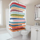 Dieser Duschvorhang hat ein modernes Design von horizontalen farbigen Linien auf einer senkrechten schwarzen Linie mit Kreisen.