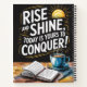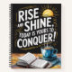 Ein spiralgebundenes Notebook mit einem Cover mit gedämpfter Aquarellbild: Eine helle und aufregende Morgenszene mit einem warmen goldenen Sonnenaufgang und einem sanften Glühen. Die Worte "Aufstieg und Glanz, heute ist euer Eroberer!" werden in kühnen, energischen Schriften dargestellt, die den Raum mit Motivation füllen. Im Vordergrund sitzt eine dampfende Tasse Morgenkaffee auf einem gemütlichen Holztisch, neben einer offenen Zeitschrift oder einer ordentlich gestapelten Aufgabenliste, die einen Neuanfang symbolisiert. Das ist auf einer Tafel skizziert