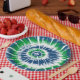 Diese lustige Platte weist eine blaue und grüne gefärbte Krawatte-Spirale auf. Wenn Sie Text hinzufügen möchten, verwenden Sie die Option "Weitere Anpassung".