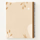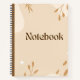 Dieses Spiralnotebook Design zeichnet sich durch eine warme, minimalistische Ästhetik aus. Das **cover** präsentiert einen weichen beigen Hintergrund mit zarten botanischen Elementen, einschließlich Zweigen und Blätter in gedämpften Braun- und Goldtönen. Diese Bio Illustrationen geben ein natürliches, beruhigendes Gefühl. Feine abstrakte Formen und weiße Glitzern verleihen der Touch eine moderne und zugleich schlichte Atmosphäre. Die **Spiralbindung** auf dem verlassen ist metallisch braun, ergänzt die erdige Farbpalette. Das Wort "Notebook" steht auf dem Cover in einem eleganten Serif-Schriftart, der Eleganz und Klarheit betont. Dieses Design ist ideal für diejenigen, die eine Kombination aus Stil und Funktionalität in der Schreibwaren schätzen.