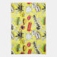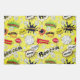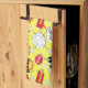 Schönes Küchentuch mit Bildern von Splash, Bauch, Boom, Crash in einem Muster auf einem gelben Hintergrund angeordnet.
