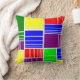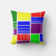 Dieses Kissen hat ein Bauhaus-Design von Rechtecken, unterteilt in immer kleinere Stücke in rot, gelb, blau, grün, lila auf einem Feld von weiß.