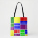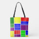 Diese Tasche hat ein Bauhaus-Design von Rechtecken in immer kleinere Stücke in rot, gelb, blau, grün, lila auf einem Feld von Weiß unterteilt.