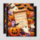 Das Design verfügt über einen Bildlauf in der Mitte über ein älteres Pergament, das einen Leerraum für Text bietet. Um die Schriftrolle herum befinden sich verschiedene Halloween-Symbole, darunter Lächeln von Jack-o’-Laternen, Geister mit verschiedenen Ausdrücken, Bonbons, Halloween-Lolli, schwarze Spinnen und Fledermäuse. Der Hintergrund ist sehr lila mit subtilen Sternmustern und schafft eine spielerische und sprichwörtliche Atmosphäre, die perfekt zu Halloween passt.