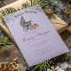 Ein skurriles, handgezeichnet Halloween "A Baby is Brewing" geschlechtsneutrales Babyduschdesign in schwarzer Tinte. Das antike Baby-Kutschen, die schwarze Krähe, der Kessel, der Hexenhut, Kürbisse und Spinnennetze auf einem lila Hintergrund. Der Rücken weist ein niedliches Muster aus viktorianischen Kinderwagen, Krähen, Spinnweben, Hexenhüten, Kürbissen und winzigen Pilzen auf.