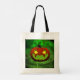 Ein leckerer orangefarbener Jack o' Laterne mit leuchtend gelben Augen in einem Lachen in einem leuchtenden grünen Nebel zu Halloween.