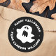 Runde Halloween Aufkleber mit einem spukhaften, weißen Geist und anpassbarem Text "Happy Halloween" und Ihrem Namen. Weißer Text auf einem schwarzen oder benutzerdefinierten Hintergrund.