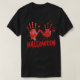 This eerie Halloween image features two blood-red handprints splattered across a black background, creating a chilling effect. Drips and splashes of red surround the prints, adding to the horror vibe. Beneath the prints, the word “HALLOWEEN” appears in bold, blood-soaked letters, giving the impression of a gruesome warning or haunted message. Perfect for a spine-tingling Halloween theme!