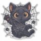 An adorable black kitten with large orange eyes caught in a silvery spiderweb, surrounded by small spiders. A charmingly spooky Halloween illustration. Great for cat lovers and Halloween enthusiasts.