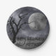 Eine beängstigende Halloween-Illustration: Die abendliche, unheimliche Landschaft mit Vollmond, Wolken und einer dunklen Silhouette mit einer hängenden Spinne.