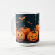 Kleine Fledermäuse fliegen über den Kürbispflaster, während sich Jack-Laternen zu Halloween-Abend versammeln.