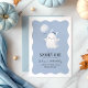 Ein wunderschöner! Jungs Einladung zum 1. Geburtstag mit niedlichem Gespenst mit blauem Ballon auf welligem Hintergrund. Die perfekte Hälfte der thematischen Erstgeburtstagseinladung für Ihre Kleinen zum Geburtstag!