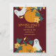 Eine spielerische Halloween-Illustration, gefüllt mit freundlichen Gespenstern, Kürbissen und blühenden Reben. Eine lustige Mischung aus leckerem und botanischem Stil in einem Vintagen Stil. Einladungen mit passenden Umschlägen.