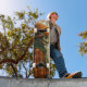 S spooky scarecrow wearing an orange hat and plaid shirt stands ominously. its skeletal face adds a chilling touch to the autumn atmosphere.