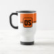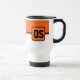 Der Reisekaffeemug wird hier mit einem farbigen Blockstil-Druck mit Beispielbuchstaben gezeigt, die Farben anpassen und ändern und Buchstaben oder kaufen, wie es ist. Farben Schwarz, Orange, Weiß Passen Sie dieses Objekt an oder kaufen Sie, wie es ist.