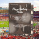 Masculine invitation fête d'anniversaire avec un thème sportif. Footballs et baseballs sont l'arrière - plan de conception pour le texte blanc à customiser en deux endroits. Tons de brun, avec motif à billes également sur le dos des cartes.