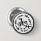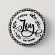 Eine sanfte Erinnerung, Freude zu verbreiten und während der Feriensaison die soziale Distanz zu wahren. Diese schwarz-weiße Knöpfe im Bauernstil zeigen das Wort Joy in schöner schwarzer Schrift/Kalligrafie. Die Wörter, die sich ausbreiten und nicht Keime, sind in allen Kappen und sind gebogen, um an den äußeren Rand des Kreisdesigns zu passen. Der Hintergrund ist ein schwarz-weißes Gingham-Druck.