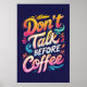 Ein eigenartiges, handgeschriebenes Typografie-Poster mit der fetten Phrase "Don’t Talk Before Coffee" im Pinselskript. Perfekte Wandkunst für Küchen, Kaffeebars, Cafés oder als Geschenk für Kaffeeliebhaber.