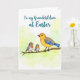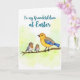 Designed with a soft spring look, this card features three little birds perched together on a thin, textured branch near the bottom. On the right, a larger bird with a sunny yellow chest and blue-gray wings stands slightly apart, angled toward the others like a gentle guardian. To the left, two smaller birds with muted gray feathers and warm orange chests lean in close, their bodies nearly touching in a way that reads like family affection or close friendship. The feather details have a brushed, painterly texture that makes them look cozy and tender rather than formal. Behind them, pale green and light yellow washes blur together like sunlit leaves, giving the scene an airy, calm mood 🌷. Near the top, the message “To my Grandchildren at Easter” is placed in flowing teal lettering, centered above the birds without crowding the artwork 🐇. The background stays softly mottled while the branch runs horizontally across the lower portion, with the birds clustered just left of center and the larger bird anchoring the right side.