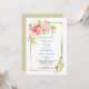 Ein hübsches Blumenstrauß im Frühling in den Farben Korallenrosa, Lavendelrosa, Weiß, Blassgelb, Gold und Blau, das sich in den aquamarinen grünen Blätter an der links Ecke dieser Hochzeitsfeier-Probe-Dinner-Einladung befindet. Ein kleineres koordinierendes Blumenbild ist unten rechts. Hinter den beiden Bildern befindet sich ein glänzender goldener Rahmen, der Ihren eigenen Text umschließt. Der Text ist in der Mitte grau und aquamarin grün. Die Aquarellbilder und der Text werden auf einem weißen Hintergrund platziert. Die Rückseite der Einladung ist festes antikes Gold. Schauen Sie sich die passenden Hochzeitsprodukte in unserem Shop an.
