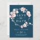 Diese Frühlingskirschblütenkarte ist Save the Date perfekt für eine moderne Hochzeit. Das orientalisch-blumengeschmückte Design besticht durch einen whimsical blush rosa Kirschenbaumzweig und grüne Blätter im eleganten japanischen Stil.