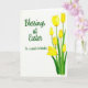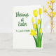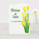This card features a bright seasonal greeting set on a white background, with a gentle, friendly tone that feels like a warm note between close friends 🌷. On the left half, a flowing, cursive-style message sits with plenty of open space around it, making the words easy to notice first. The lettering appears in a dark, near-black ink, aligned slightly toward the center rather than pressed to the edge. On the right half, a clustered spray of yellow, cup-shaped spring flowers rises upward, like a small bouquet offered with a tender glance 🐇. Some blooms are still curled as buds while others open wider, showing soft gradients of sunny yellow that deepen near the centers. Slender green stems and layered leaves fan out below, adding a fresh contrast against the white field. The petals show faint watercolor-like shading and slightly uneven drawn outlines, and the bouquet leans subtly to the right with several blossoms at different heights.