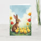 This design shows a brown rabbit sitting calmly in the middle of a spring meadow, watching four fluffy yellow ducklings gather close as if drawn in by a gentle friendship 🐰. The rabbit’s dark, alert eyes and upright ears face the little group, while the ducklings form a loose half-circle with orange beaks and feet turned toward it, like they’re sharing a quiet moment together. Around them, fresh green grass fills the foreground with tiny white and pale yellow wildflowers scattered between the blades. Taller flowers rise behind the animals, mixing sunny yellow blooms with red tulips that frame the scene like a garden border 🌷. Across the top, a short Easter greeting sits centered in soft lettering, set in a warm pastel tone that stands out against the sky. The background sky fades from light blue overhead to a creamy glow near the horizon, with rounded clouds drifting across. Golden light falls evenly across the rabbit’s fur and the ducklings’ down, and the red tulips lean slightly inward from both sides.