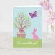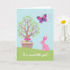 This card features a spring scene centered on a stylized tree with fresh green leaves and small pink and blue blossoms, growing from a simple planter on a gentle green slope. Beneath the branches, patterned egg shapes in pink, yellow, green, and blue nestle together, with their close spacing suggesting a cozy, shared celebration. A small banner near the eggs carries a seasonal greeting in a contrasting color, placed so it gently curves across the lower center. On the right side, a soft pink bunny 🐰 sits on the grass with a calm posture, angled toward the display as if quietly keeping someone company. Above, a purple-and-fuchsia butterfly glides through a pale blue sky, its dotted flight trail looping in a way that feels like a friendly hello. Near the upper area, the line “To a sweet little girl!” appears in a flowing cursive style, set in a darker shade for easy reading against the light background. The tree’s branches spread outward with scattered blossoms, while the dotted line arcs behind the butterfly 🐇.