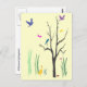 Diese Postkarte schafft eine farbenfrohe, skurrile Frühlingsstimmung. Vögel fliegen und stehen im Baum. Schmetterlinge schweben in der warmen Luft. Eine Ente wadelt im Gras. Es gibt sogar eine winzige Schnecke auf dem Boden.