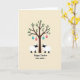 This card features a stylized tree with an earthy brown trunk and thin branches reaching upward, dotted with a few fresh green leaves that hint at early spring. From the branches hang four egg-shaped ornaments in alternating soft pink and light blue, adding a gentle Easter touch 🌷. Beneath the tree stand two fluffy sheep with cloud-like white wool, simple black faces, tiny dark eyes, and slender black legs. They face inward from either side of the trunk, as if sharing a quiet moment together, their calm expressions and balanced stance suggesting an easy friendship. The background stays a smooth creamy beige, keeping the focus on the tree and the pair. A short line of text sits near the bottom in a dark, easy-to-read color, spaced neatly below the scene like a small caption. The eggs are evenly spaced along the branches, with the pink and blue tones alternating above the two sheep 🐰.
