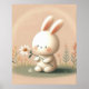 Dieses Kunstwerk zeigt ein bezauberndes, weißes Kaninchen mit einer zarten, daisy Blume. Das weiche Fell des Kaninchens, rosige Wangen und lange Ohren schaffen ein Gefühl von Wärme und Unschuld. Die Illustration wird in einer sanften und beruhigenden Farbpalette dargestellt, die ein Gefühl von Ruhe und Ruhe weckt
