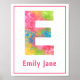 Der niedliche Druck für Kinderzimmer- oder Kinderzimmer bietet einen mehrfarbigen Spritzer-Farbbrief E mit anpassbarem rosa Text und einem dünnen rosa Rahmen.